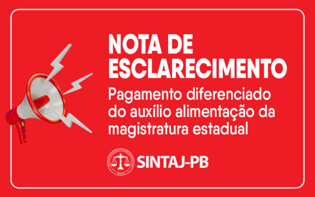 As direções da ASSTJE-PB e do SINTAJ-PB, tendo conhecimento do ADM, n. 2022129742, no qual a AMPB pleiteia pagamento diferenciado no auxílio alimentação da magistratura estadual, INFORMAM que estão analisando tecnicamente a questão com suas assessorias jurídicas e que, na próxima semana, se reunirão para encaminhar posicionamento oficial conjunto em relação ao tema. A priori,…