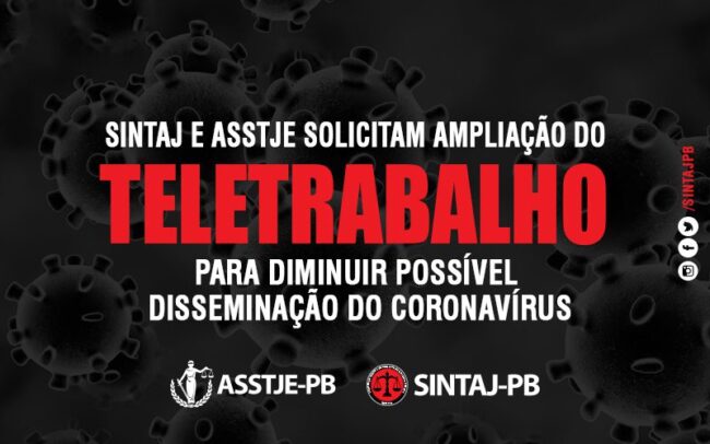 O SINTAJ/PB e a ASSTJE/PB solicitaram a adoção de medidas para combater possível disseminação do Coronavírus nas fileiras do judiciário estadual. As Entidades requereram ao Presidente que: I – Decrete o regime de teletrabalho como preferencial por prazo não inferior a 30 (trinta) dias, tendo como prioridade os servidores: a) portadores de doenças respiratórias crônicas;…