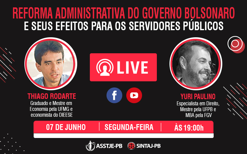 No próximo dia 07 de junho, o SINTAJ e a ASSTJE promovem uma live para discutir os efeitos da Reforma Administrativa, proposta pelo Governo Bolsonaro. O objetivo é esclarecer os efeitos negativos da reforma para os servidores públicos estaduais, incluindo os servidores do Judiciário paraibano. A live será realizada a partir das 19h, através do canal do SINTAJ no Youtube e página no facebook.